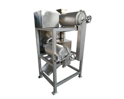 DJ型打漿機:電機由皮帶驅動,使安裝在花鍵上的刮板高速旋轉。當碎果通過進料口進入機器時,紙漿板將材料均勻地排列到刮板和篩子上。由于刮板的旋轉效應和導向角的存在,物料沿鋼瓶向出口端移動,運動軌跡為螺旋運動,物料在刮板與篩管之間移動過程中被離心力刮傷,并將料斗中的汁液和肉(已呈紙漿狀)從渣斗中排出,并從渣斗中排出果皮和種子。以達到自動分離的目的。只要改變不同規格的篩網,調整刮板導向角,可以改變打漿速度,取得滿意的效果。